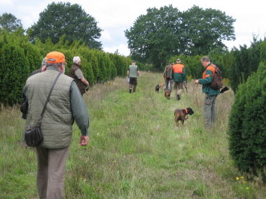 Einen Sommer lang übten die Hundeführer nahezu jeden Samstag Gehorsam und in der Woche Schweißfährten. Endlich war es nun soweit der Prüfungstag war da. Die Kandidaten trafen sich pünktlich und auch die drei Prüfer ließen nicht auf sich warten. Zunächst mussten sich alle Hundeführer, ausgerüstet mit den Papieren ihrer Hunde beim Prüfungsleiter anmelden und natürlich die Prüfungsgebühr bezahlen. Nach einer einführenden Rede des Prüfungsleiters und des Obmannes der Prüfergruppe fand die Verlosung statt. Jeder wünschte sich nicht der erste zu sein und als letzter wollte auch keiner unbedingt an der Reihe sein. Diejenigen, die es dann traf, trugen ihr Schicksal mit Humor. Zuerst wurden die Hunde auf der Nachsuche für Schalenwild geprüft. Am Vortag hatten die Fährtenleger vier 400 Meter Fährten und zwei 800 Meter Fährten im Revier Müssen 1 gelegt. Mit zwei Fahrzeugen wurden die Prüfer, die Fährtenleger und jeweils ein Prüfling in die Nähe des Anschusses gefahren. Die Wartezeit vertrieb man sich mit fachsimpeln über Hundearbeit. In der Nacht hatte es geregnet und so hofften Alle, dass die Fährten doch noch den Duft gehalten hatten und die Suche für die Hunde nicht ganz so schwer war. Am Ende kam es dann auch so, dass alle Hunde am Stück ankamen und die Prüfung bestanden hatten. Jetzt war es bereits Mittag geworden und die Gehorsamsprüfung konnte beginnen. Bewertet wurden u. a. die Leinenführigkeit, folgen frei bei Fuß, Verhalten auf dem Stand und ablegen. Am Ende hatten es leider zwei Hunde nicht geschafft. Sie hatten beim Verhalten auf dem Stand nicht die Prüfungsanforderung gezeigt. Das klappt bestimmt beim nächsten Mal. Denn vorbereitet hatten sich alle sehr gut. Aber wie sagt man so schön, ein Hund ist auch nur ein Mensch.